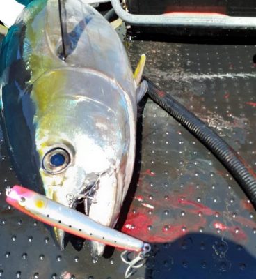 ヒットルアーはウッドリーム・アキヤポッパー185小平商店オリジナルカラー“ピンクマイワシ”