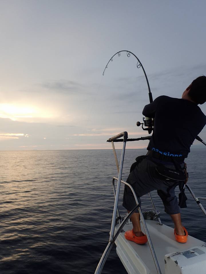 青いスレッドのロッドは荻原氏がノースカロライナで130キロのクロマグロをキャッチした『70XHプロト』です。
